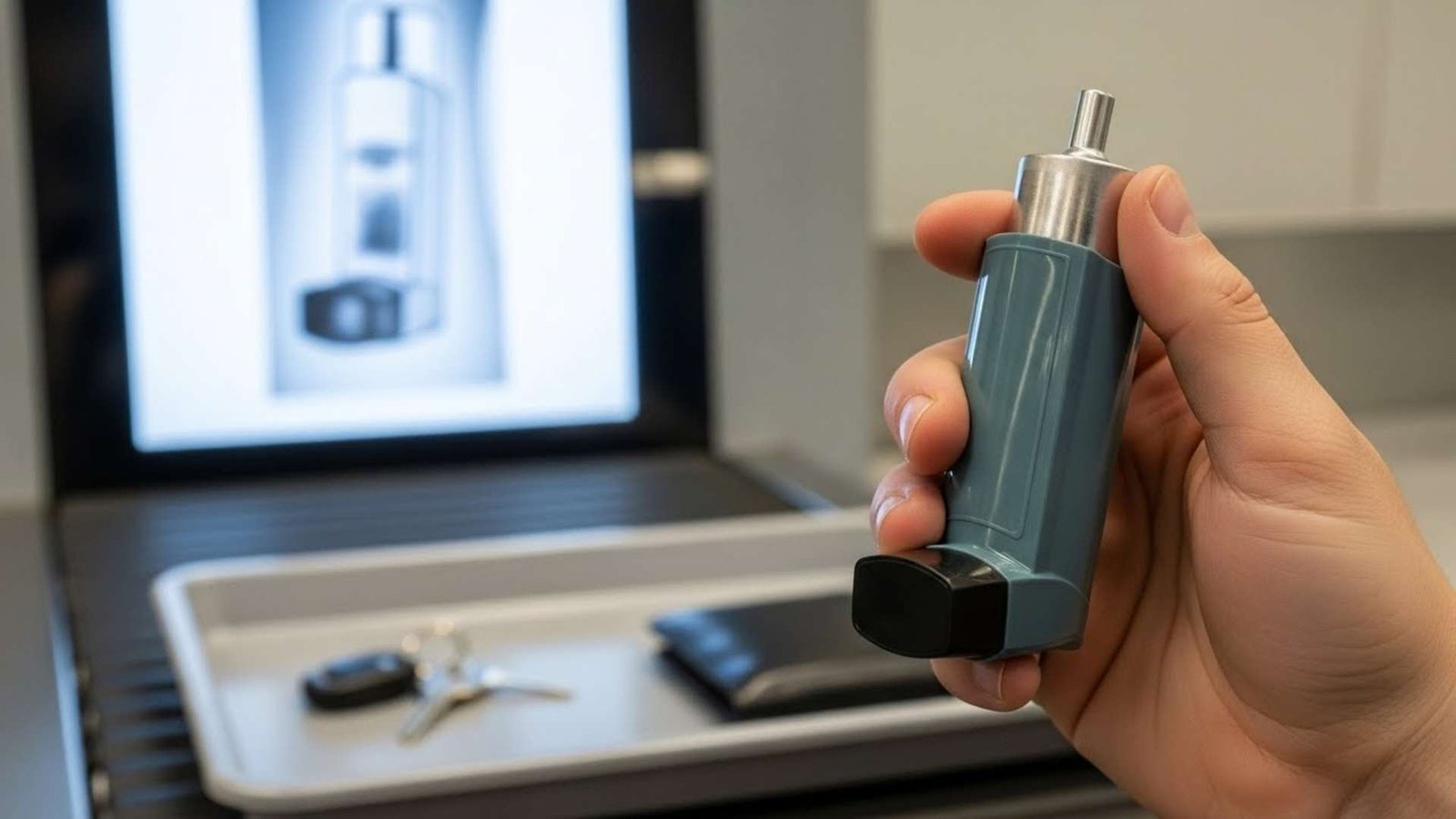 Inhalers are obviously allowed, but the canister is a pressurized metal cylinder containing liquid. It looks like a mini pipe bomb or a gas canister on the screen.