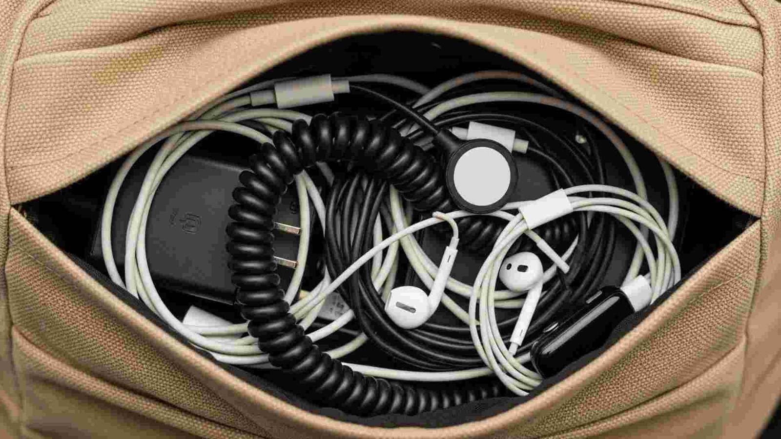I am guilty of this. You throw your laptop charger, phone cord, watch charger, and headphones into one pocket.